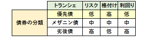 一般に優先債は、ローリスク・ローリターンのため、元利金の支払いを優先的に受けられますが、一方で運用の利回りは一番低くなります。また、格付け(信用力)の高さは、優先債>メザニン債>劣後債の順ですが、一方で利回りの高さは、その逆です。それゆえ、運用の際には、投資家は自身のリスク許容度に応じて、投資対象を選択することになります。