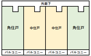 一般に角住戸は、建物の側面に位置し、二面あるいは三面に窓やバルコニーが取れるものもあり、採光性や通風性などに優れていると言えます。その一方で、価格面では、同じ専有面積の場合、左右を挟まれた中住戸より高くなっています。