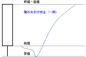 陽の大引け坊主は、陽線のうち、上ヒゲのない大陽線のことをいいます。