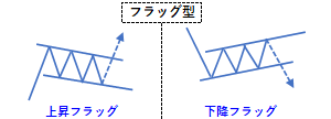 フラッグ型は、「フラッグ・フォーメーション」とも呼ばれ、斜めに傾いた旗(フラッグ)のような形状のチャートパターンをいいます。